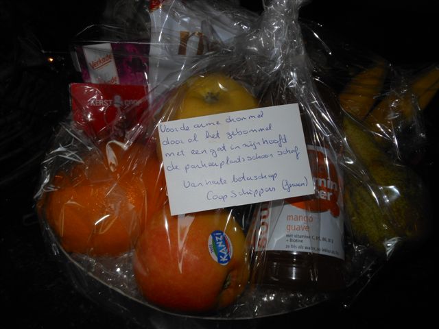 Ook zie je bij winkels dat mensen met hun karretjes door de prut moeten om de boodschappen in de auto te krijgen, dat is geen pretje lijkt me. Ook is het een extra service voor de klanten van het desbetreffende bedrijf. Voor ons is dat een weliswaar zware periode, zie de afgelopen winters, maar wel een zeer welkome en dankbare taak in de winter…. Want in de winter hebben wij het juist rustiger en het materiaal is bij ons wel aanwezig om de klus te klaren. Ook onze jongens mogen dit werk graag in de nacht doen…. Het is dan nog niet zo druk overal en in die mooie witte omgeving is het leuk werken. Dus wij maken graag voor dat de winkels opengaan de wegen en de parkeerplaatsen sneeuw en ijsvrij. Ook onze vaste klanten die dat nodig vinden behoeden wij voor sneeuw en gladheid….. Terwijl ik dit schrijf zijn we vroeg in December al weer een paar keer op pad geweest. Ook kwam ik er zelf weer eens achter op een zeer pijnlijke wijze dat de sneeuw echt alles bedekt. Tijdens het schuiven van sneeuw en het afvoeren… kwam ik zelf een verborgen stoeprand tegen met de shovel. En dan sta je ineens stil van 25 km per uur naar nul….. Maar gelukkig werd ik even bijgepraat door Jeroen Schippers van de Coop in Odoorn die vertelde waar ik was en hoe ik er kwam….. En dat dat ‘beetje’ bloed helemaal niet zo erg was…. Dus na een opbeurend gesprek vervolgde ik mijn weg….. En overal waar ik nu kom kijk ik heel goed naar stoepranden en uitstekende delen in het anders zo vlakke wegdek. Maar een prachtige fruitmand van de Coop in Odoorn deed de pijn erg verzachten….